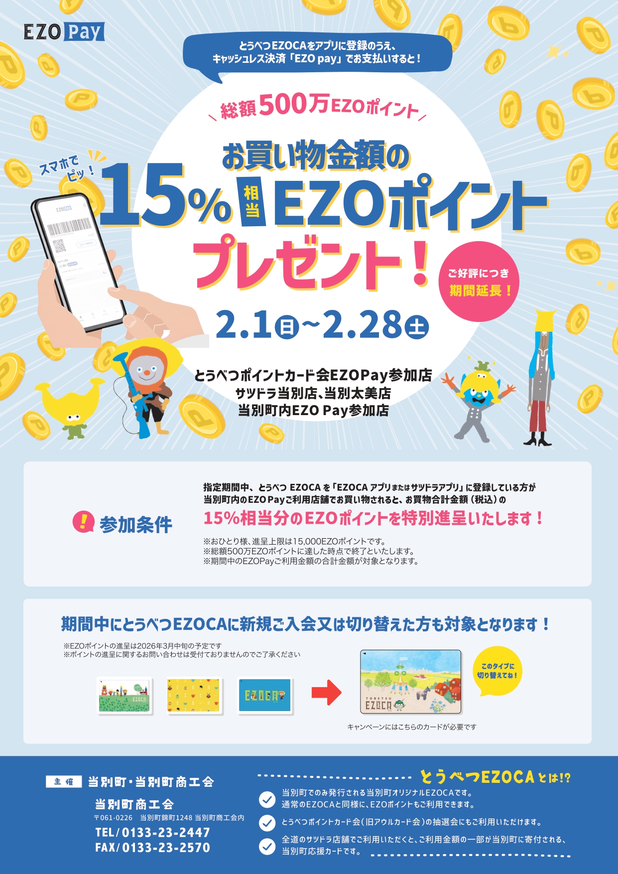 【好評につき延長!】とうべつEZOCA×EZO Payキャンペーン開催!!15%相当EZOポイントプレゼント!