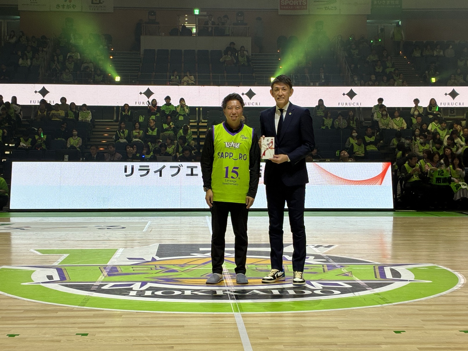サツドラホールディングス株式会社(本社:札幌市東区/代表取締役社長 CEO:富山 浩樹)のグループ会社である株式会社リージョナルマーケティング(本社:札幌市東区/代表取締役社長 COO:渡部 真也、以下「RM」)は、「レバンガ北海道」を運営する株式会社レバンガ北海道(本社:札幌市厚別区/代表取締役社長:折茂 武彦、以下「レバンガ」)との提携に基づき、「NEXT ORIMO PROJECT」による2024-25シーズンの還元金539,989円を2025-26シーズンホーム戦が行われた3 月11日(水)に贈呈したことをお知らせいたします。